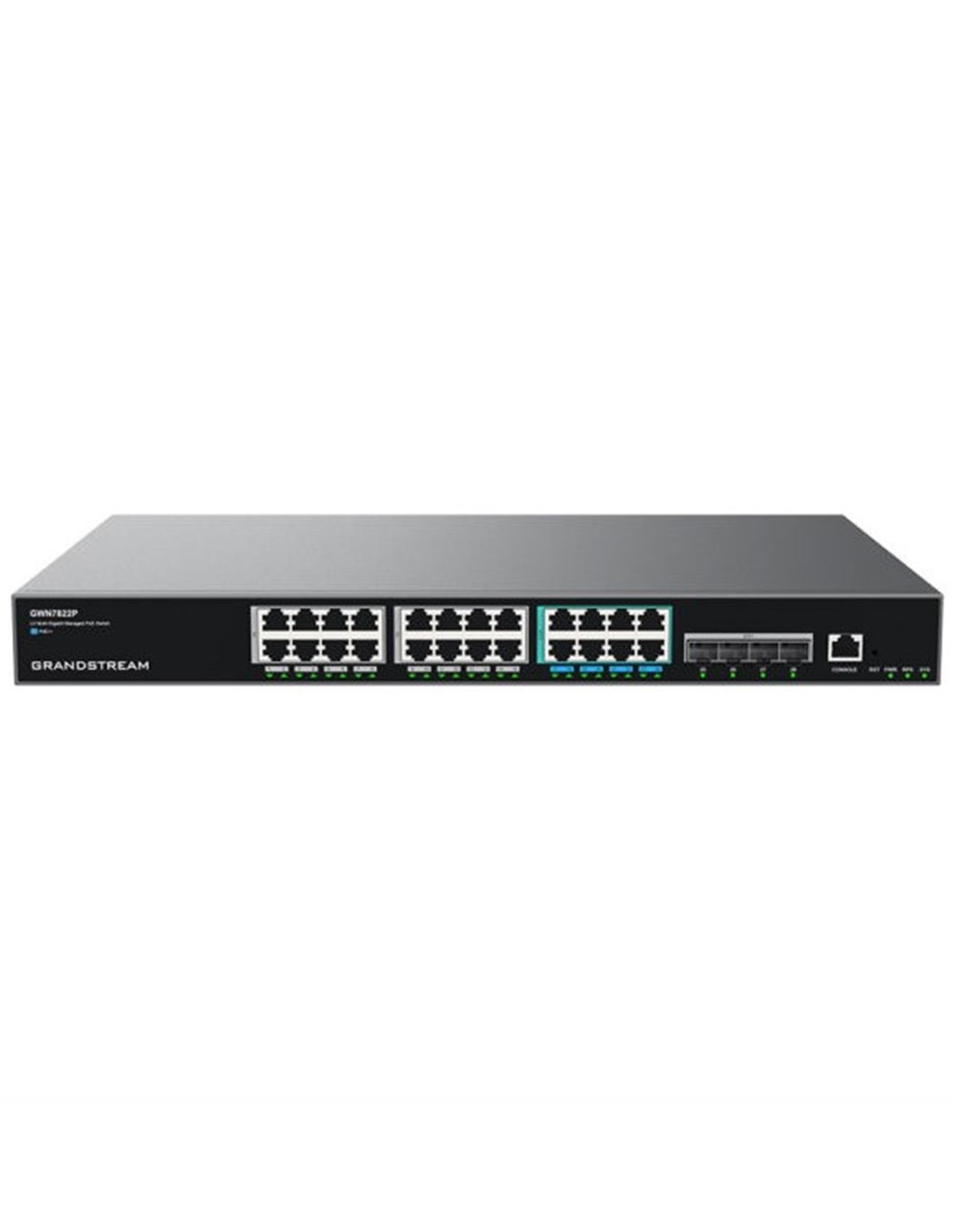 The Grandstream GR-GWN7822P is a high-performance Layer 3 managed multi-gig PoE+ switch engineered for enterprise, campus and high-density edge networks. It combines 8× 2.5GbE PoE+ ports, 16× Gigabit Ethernet PoE+ ports and 4× 10Gb SFP+ uplinks to deliver fast access, advanced routing and powerful PoE from a single platform.