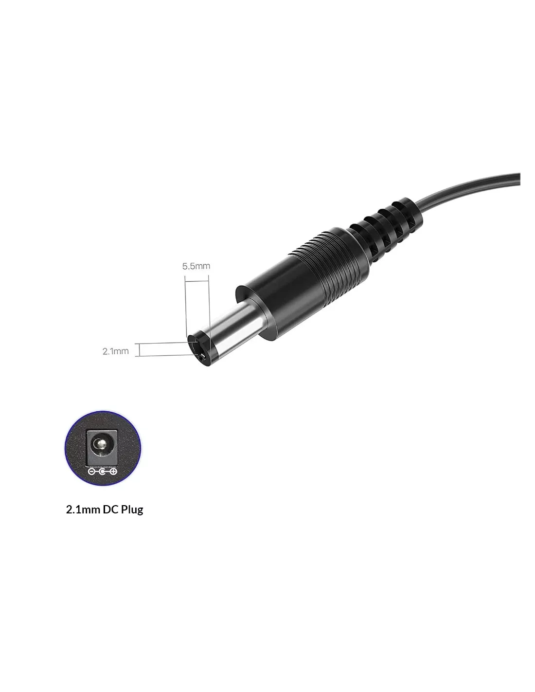 - Connector: 5.5 mm OD × 2.1 mm ID barrel, centre-positive
